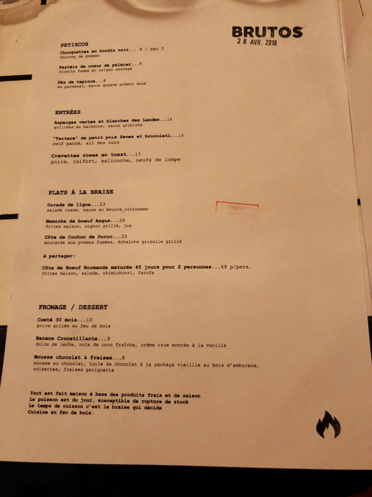 O Brutos, apesar do nome, é tudo, menos brutal. Primeiro graças à decoração minimalista – mas bem cuidada, luzes amareladas e de baixa intensidade que criam um conforto imediato, completo pelas velas e pelos delicados arranjos de flores nas mesas. Em seguida pelas músicas de fundo, sempre gostosas e bem selecionadas. E sobretudo pelo perfume acolhedor de comida grelhada que emana da cozinha. Isso tudo é obra de um casal de chefs brasileiros, Lucas Baur de Campos e Ninon Lecomte, que conseguiram de maneira muito bem-sucedida casar Brasil e França sem ter que cair nos clichês. Alias, a origem tupiniquim não é o foco da comunicação feita pelo restaurante, e ainda bem porque o Brutos é tão mais do que uma etiqueta redutora de proveniência.