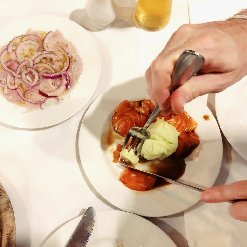 Agora, sobre o meu problema: eu não suporto peixe. Até o dia em que eu pisei no Uri Buri. Depois de muita hesitação, pedimos duas entradas tímidas acompanhadas de vinho branco. Alias, parênteses: o vinho local é EXCELENTE. Pode ir sem medo. Nosso sashimi de salmão no shoyo com sorvete de wasabi e ceviche de dourado me deram um baque. Peraí, pensei, eu estou num restaurante muuuuito bom. E de repente veio essa sensação de descontrole e improviso, deliciosa, que a gente experimenta apenas viajando.
